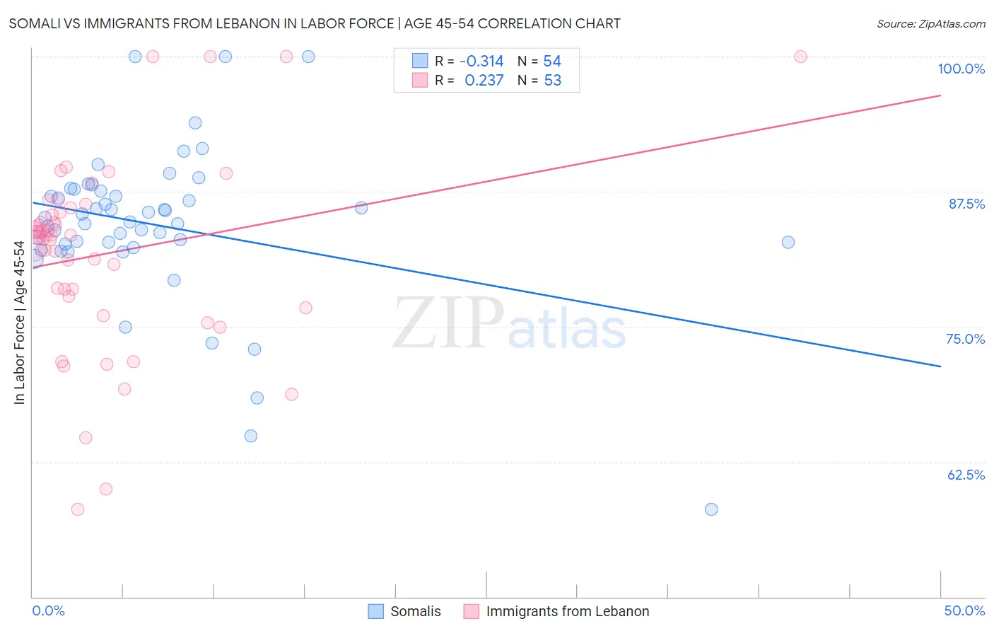 Somali vs Immigrants from Lebanon In Labor Force | Age 45-54 Correlation Chart
