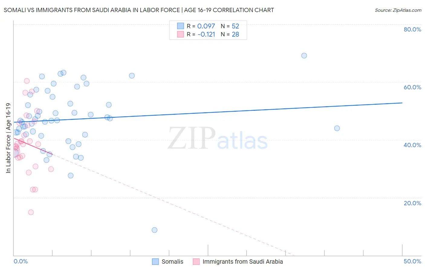 Somali vs Immigrants from Saudi Arabia In Labor Force | Age 16-19 Correlation Chart
