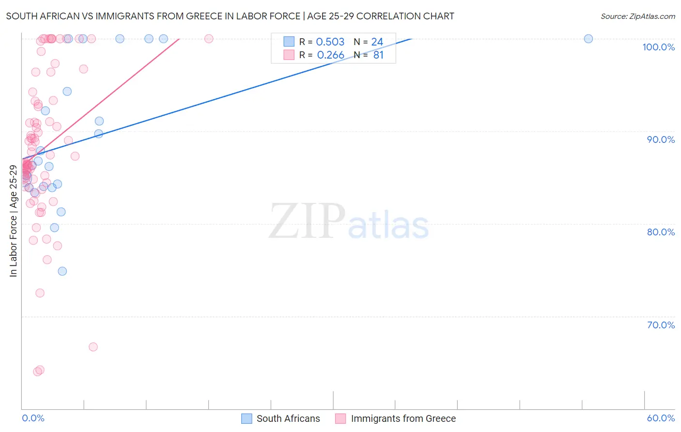 South African vs Immigrants from Greece In Labor Force | Age 25-29 Correlation Chart