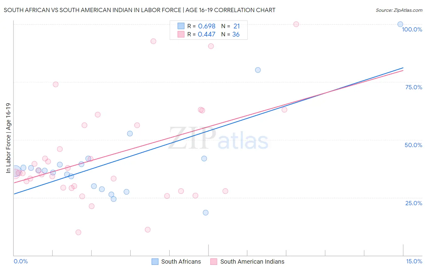 South African vs South American Indian In Labor Force | Age 16-19 Correlation Chart