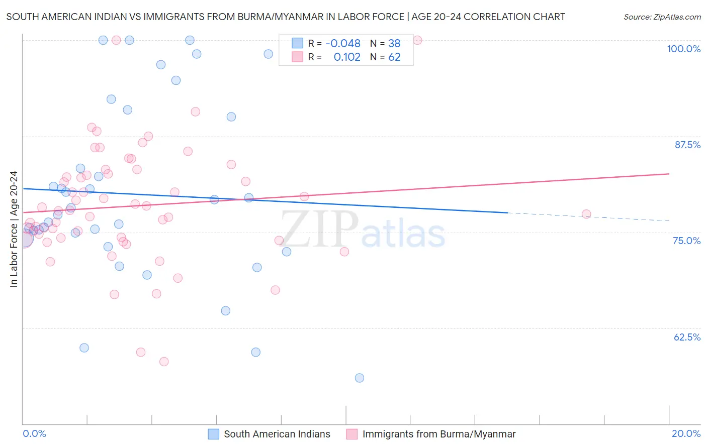 South American Indian vs Immigrants from Burma/Myanmar In Labor Force | Age 20-24 Correlation Chart
