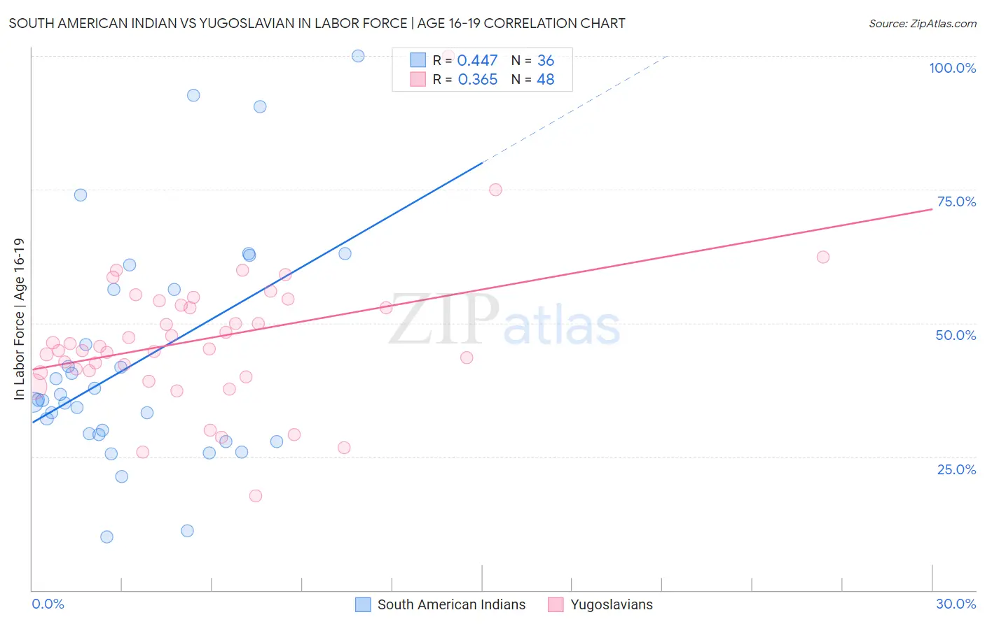 South American Indian vs Yugoslavian In Labor Force | Age 16-19 Correlation Chart