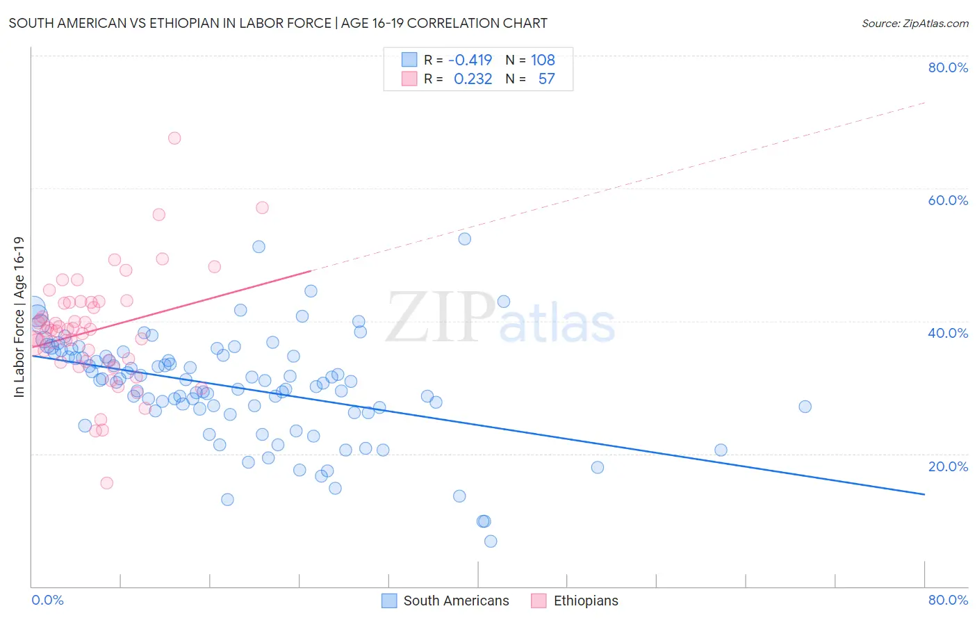 South American vs Ethiopian In Labor Force | Age 16-19 Correlation Chart