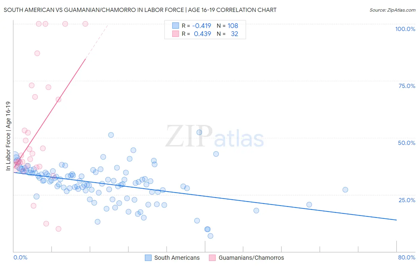 South American vs Guamanian/Chamorro In Labor Force | Age 16-19 Correlation Chart