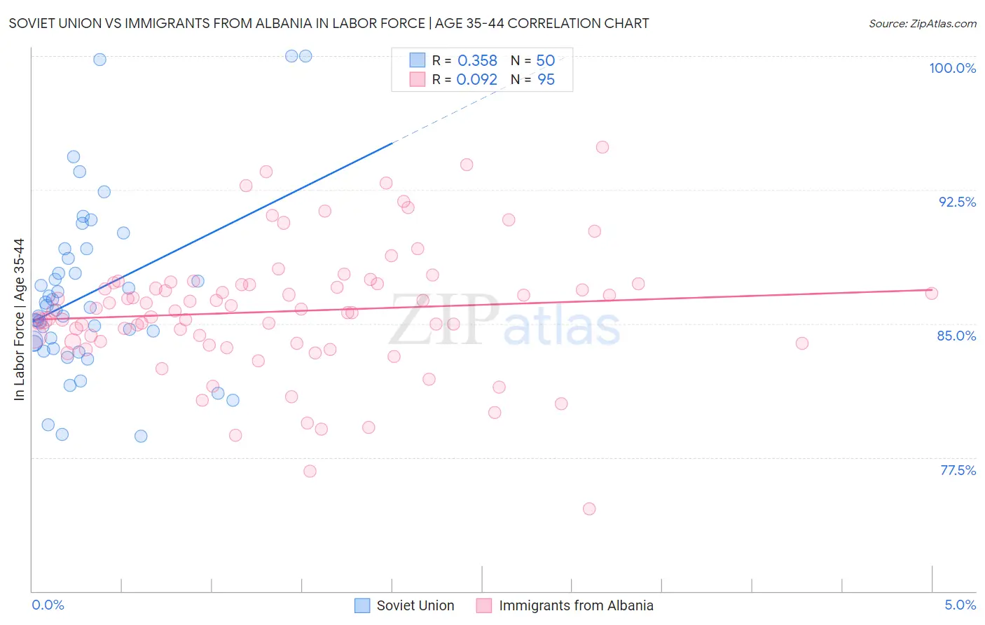 Soviet Union vs Immigrants from Albania In Labor Force | Age 35-44 Correlation Chart