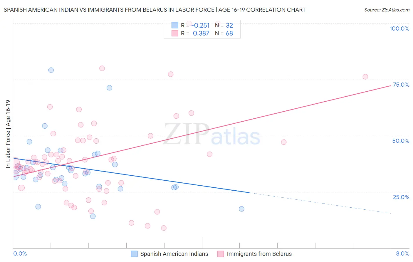 Spanish American Indian vs Immigrants from Belarus In Labor Force | Age 16-19 Correlation Chart