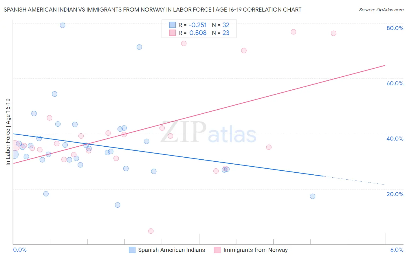 Spanish American Indian vs Immigrants from Norway In Labor Force | Age 16-19 Correlation Chart