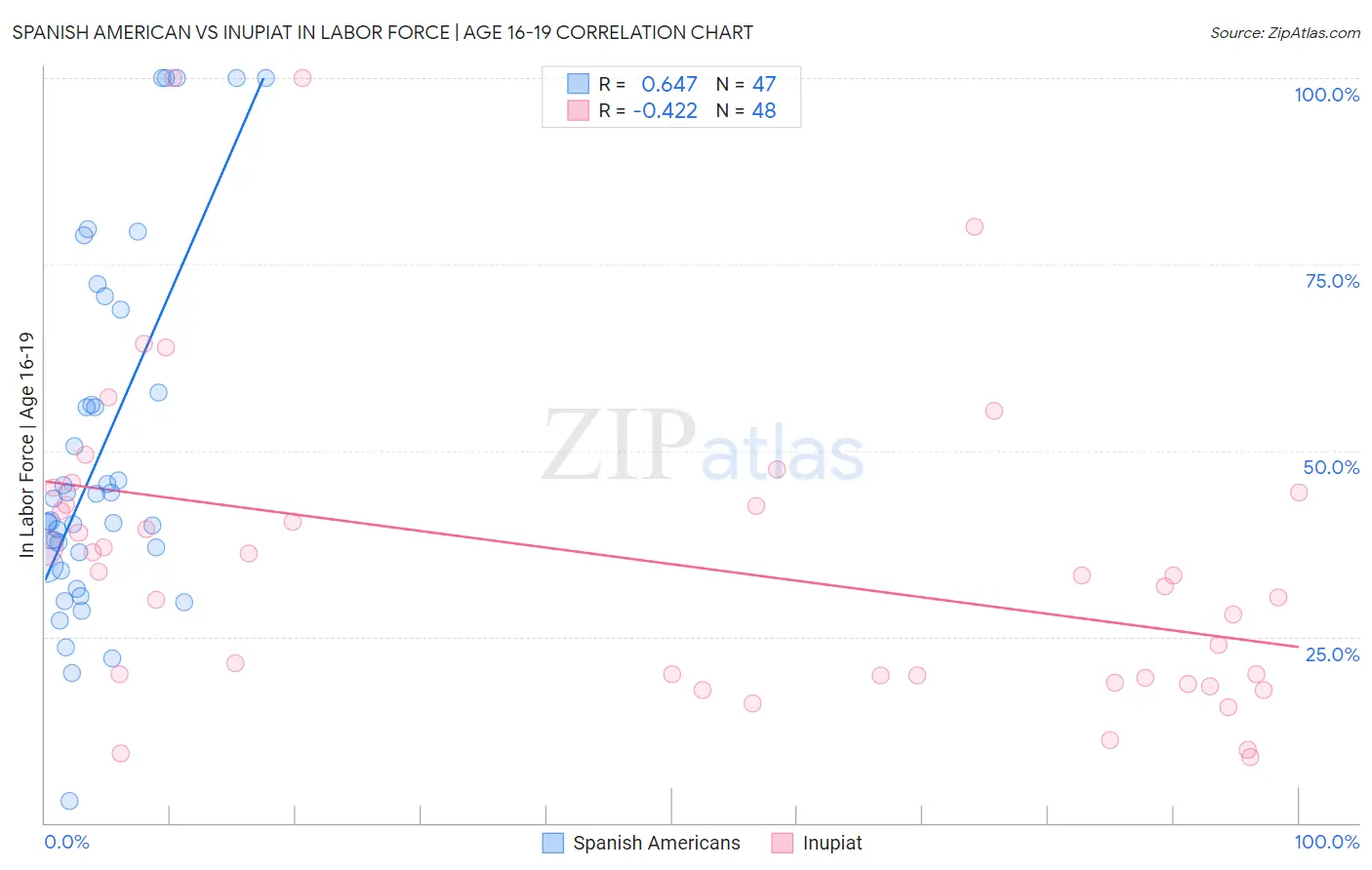 Spanish American vs Inupiat In Labor Force | Age 16-19 Correlation Chart