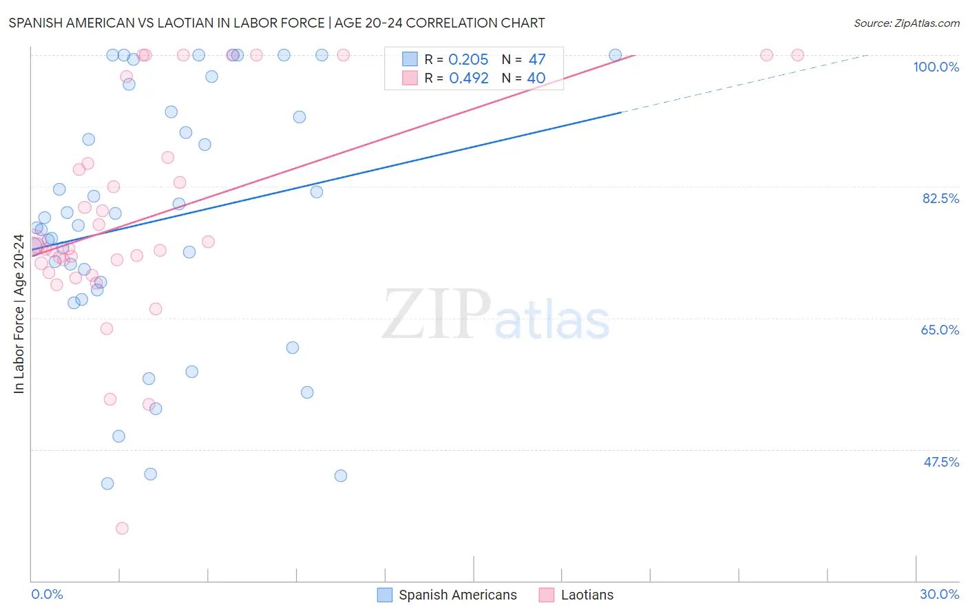Spanish American vs Laotian In Labor Force | Age 20-24 Correlation Chart
