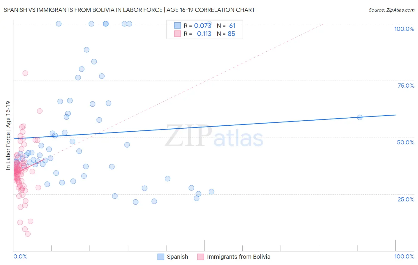 Spanish vs Immigrants from Bolivia In Labor Force | Age 16-19 Correlation Chart