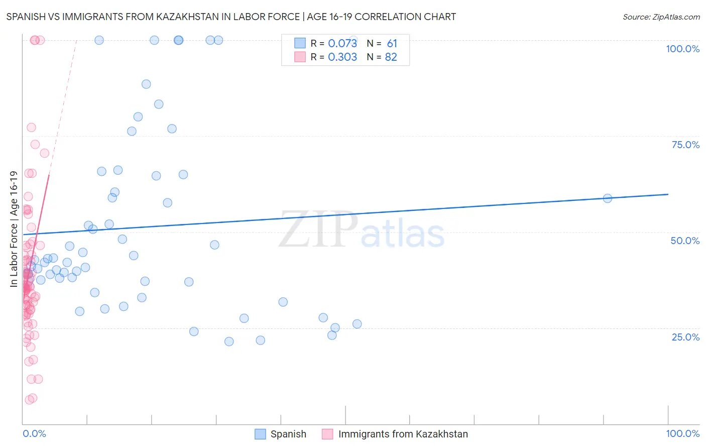 Spanish vs Immigrants from Kazakhstan In Labor Force | Age 16-19 Correlation Chart