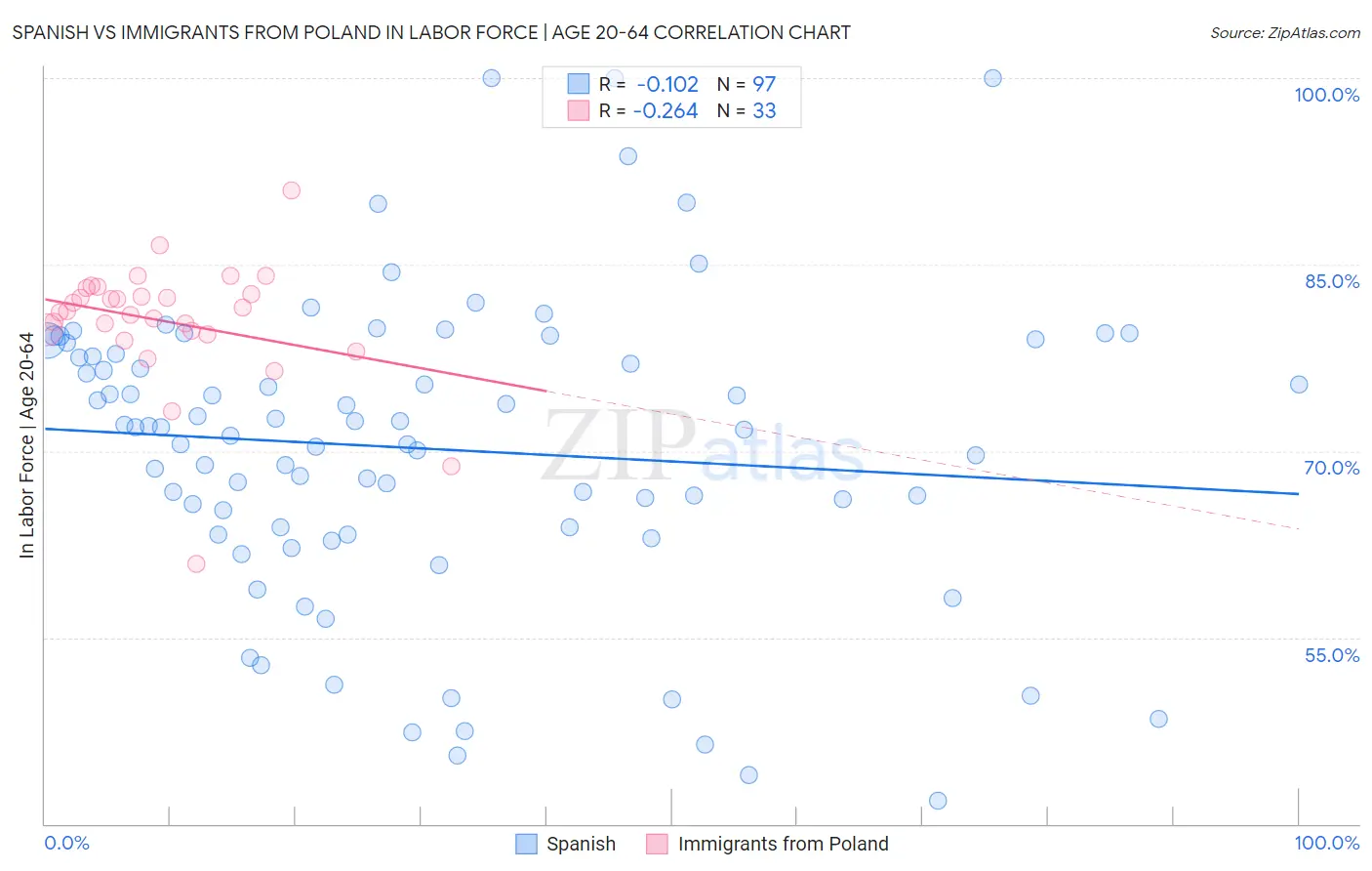 Spanish vs Immigrants from Poland In Labor Force | Age 20-64 Correlation Chart
