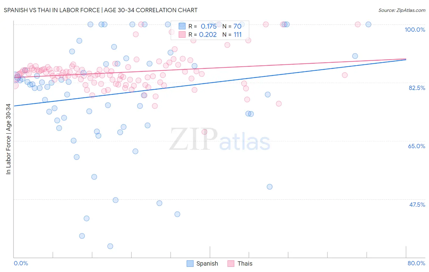 Spanish vs Thai In Labor Force | Age 30-34 Correlation Chart