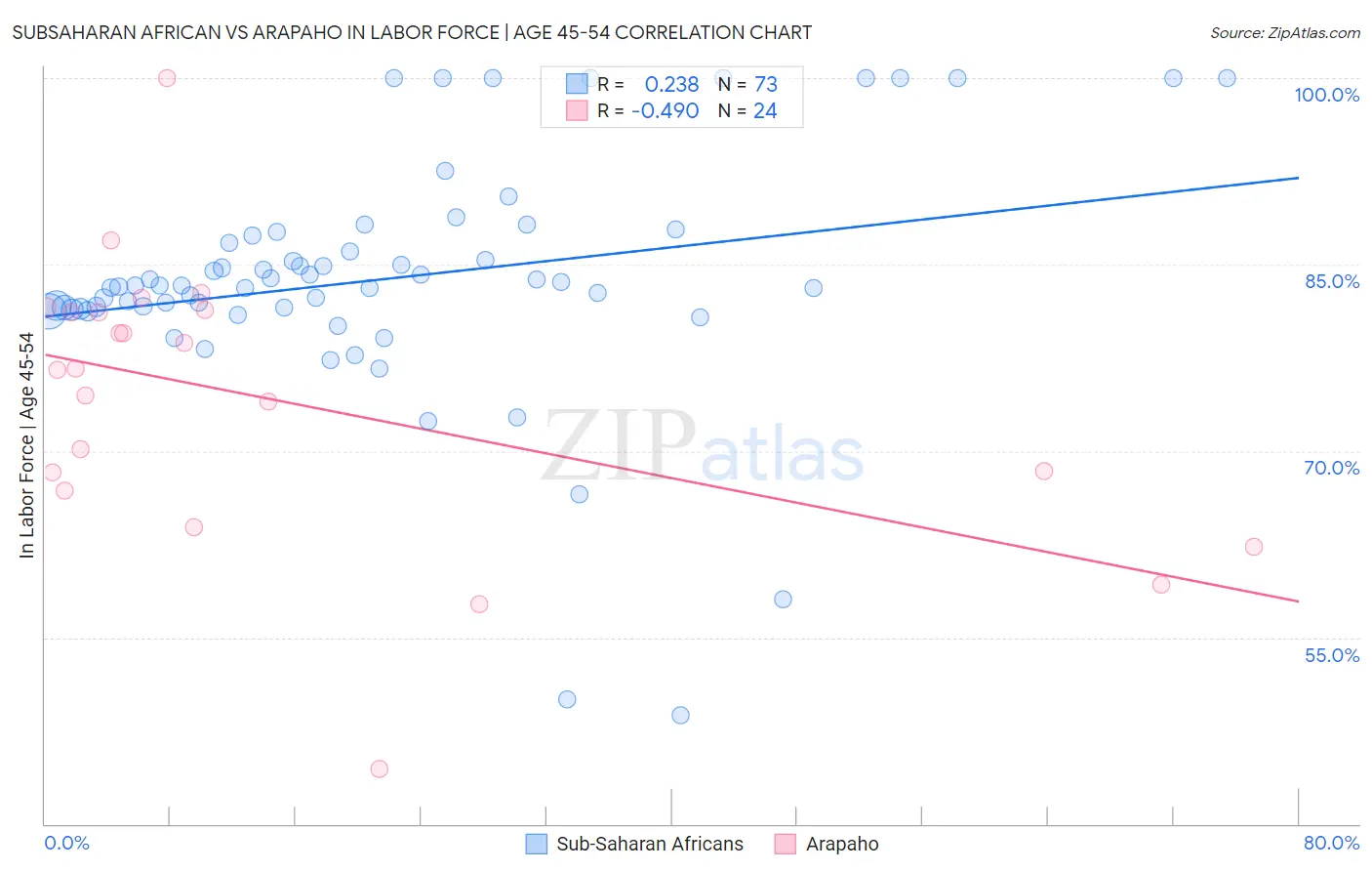 Subsaharan African vs Arapaho In Labor Force | Age 45-54 Correlation Chart