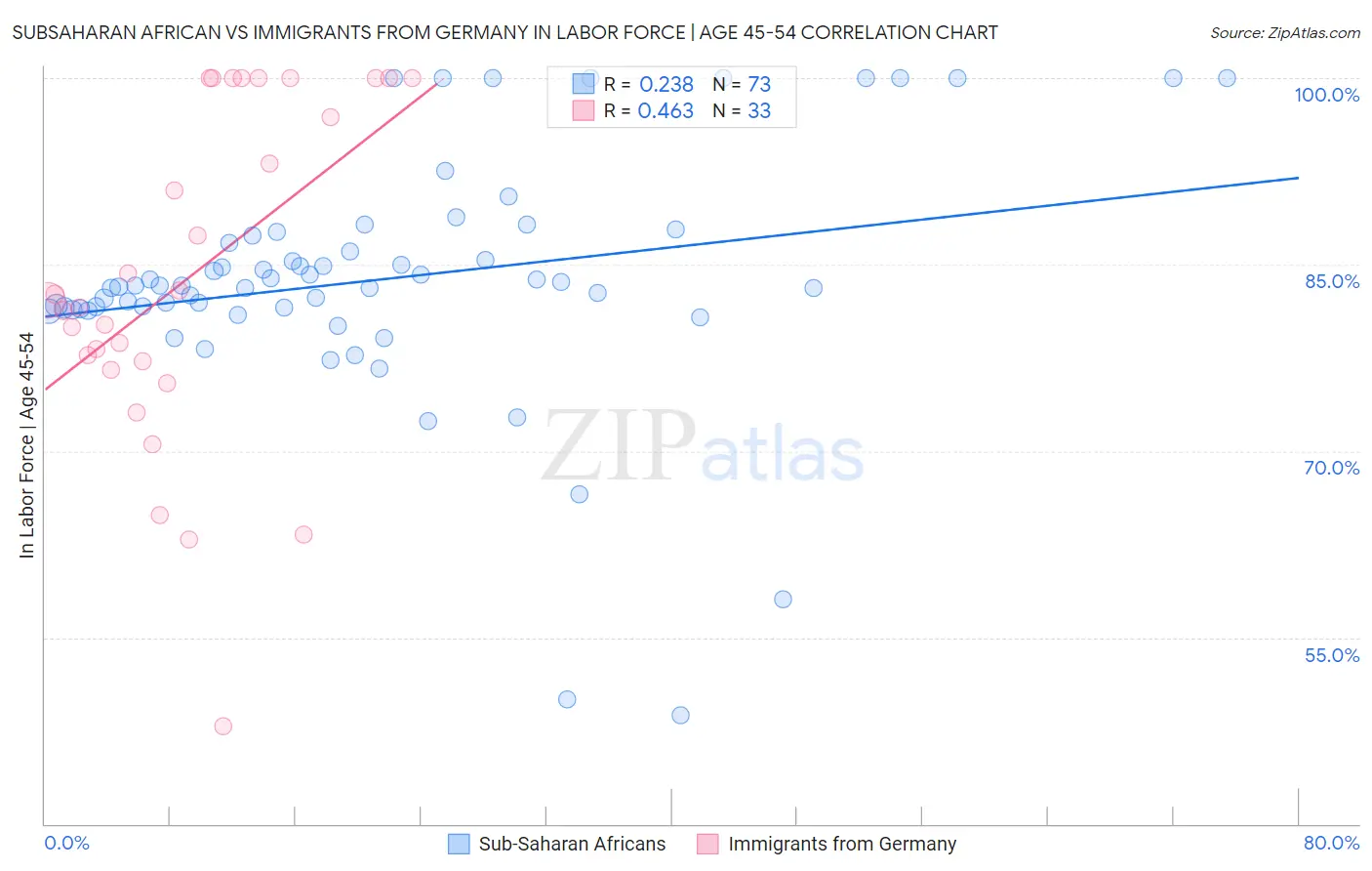 Subsaharan African vs Immigrants from Germany In Labor Force | Age 45-54 Correlation Chart