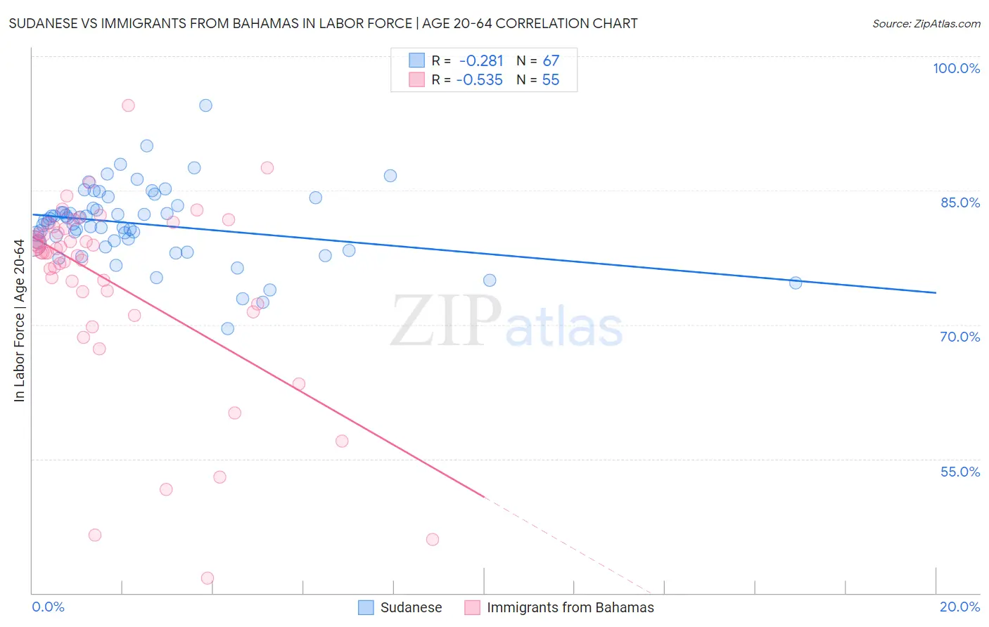 Sudanese vs Immigrants from Bahamas In Labor Force | Age 20-64 Correlation Chart