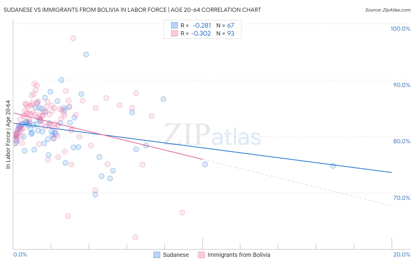 Sudanese vs Immigrants from Bolivia In Labor Force | Age 20-64 Correlation Chart