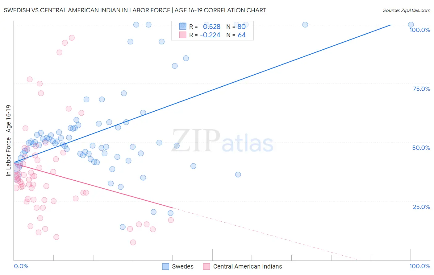 Swedish vs Central American Indian In Labor Force | Age 16-19 Correlation Chart