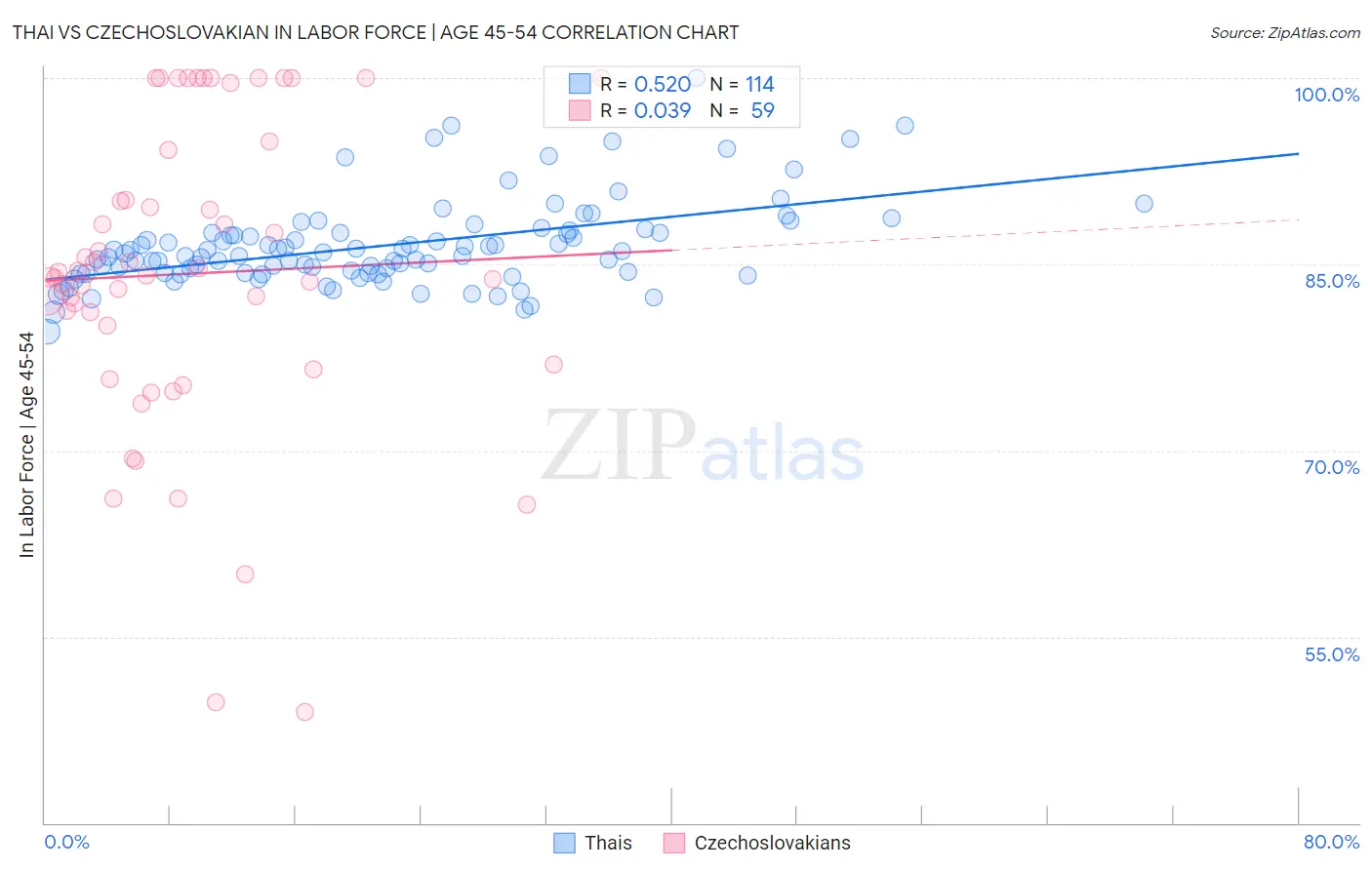 Thai vs Czechoslovakian In Labor Force | Age 45-54 Correlation Chart