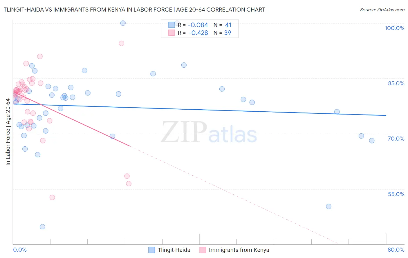 Tlingit-Haida vs Immigrants from Kenya In Labor Force | Age 20-64 Correlation Chart