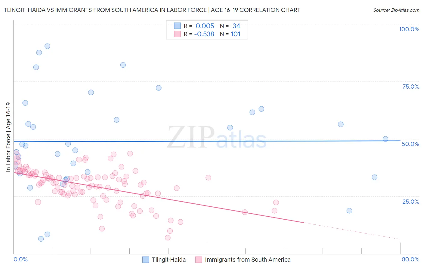 Tlingit-Haida vs Immigrants from South America In Labor Force | Age 16-19 Correlation Chart