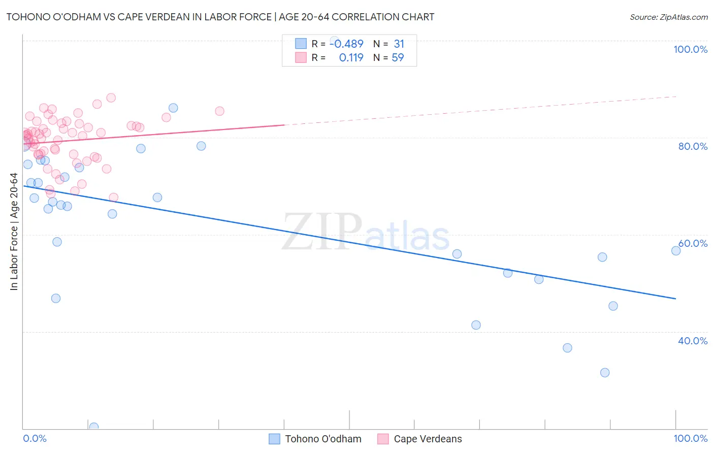 Tohono O'odham vs Cape Verdean In Labor Force | Age 20-64 Correlation Chart