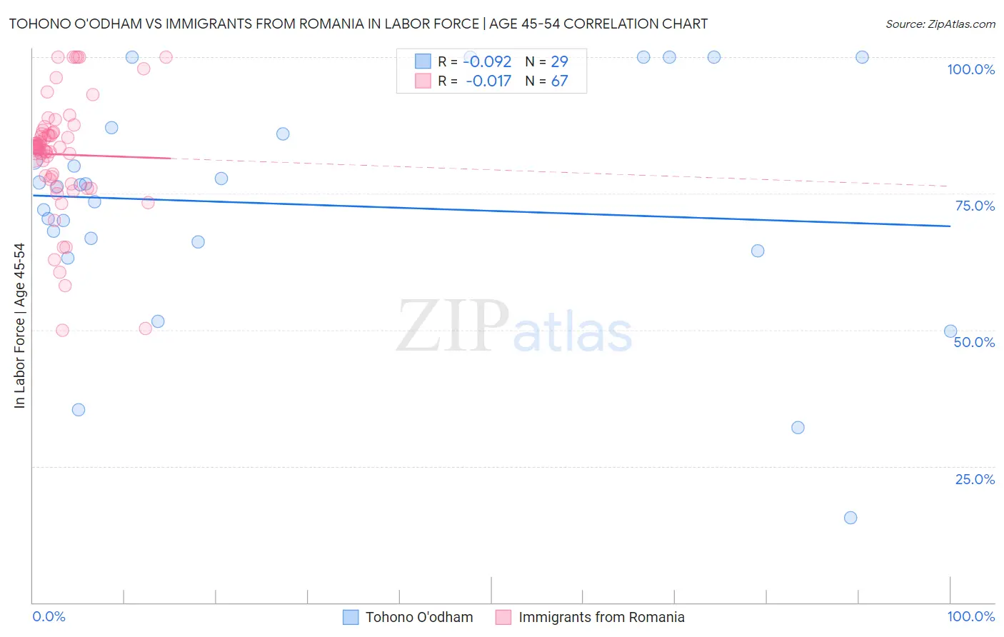 Tohono O'odham vs Immigrants from Romania In Labor Force | Age 45-54 Correlation Chart