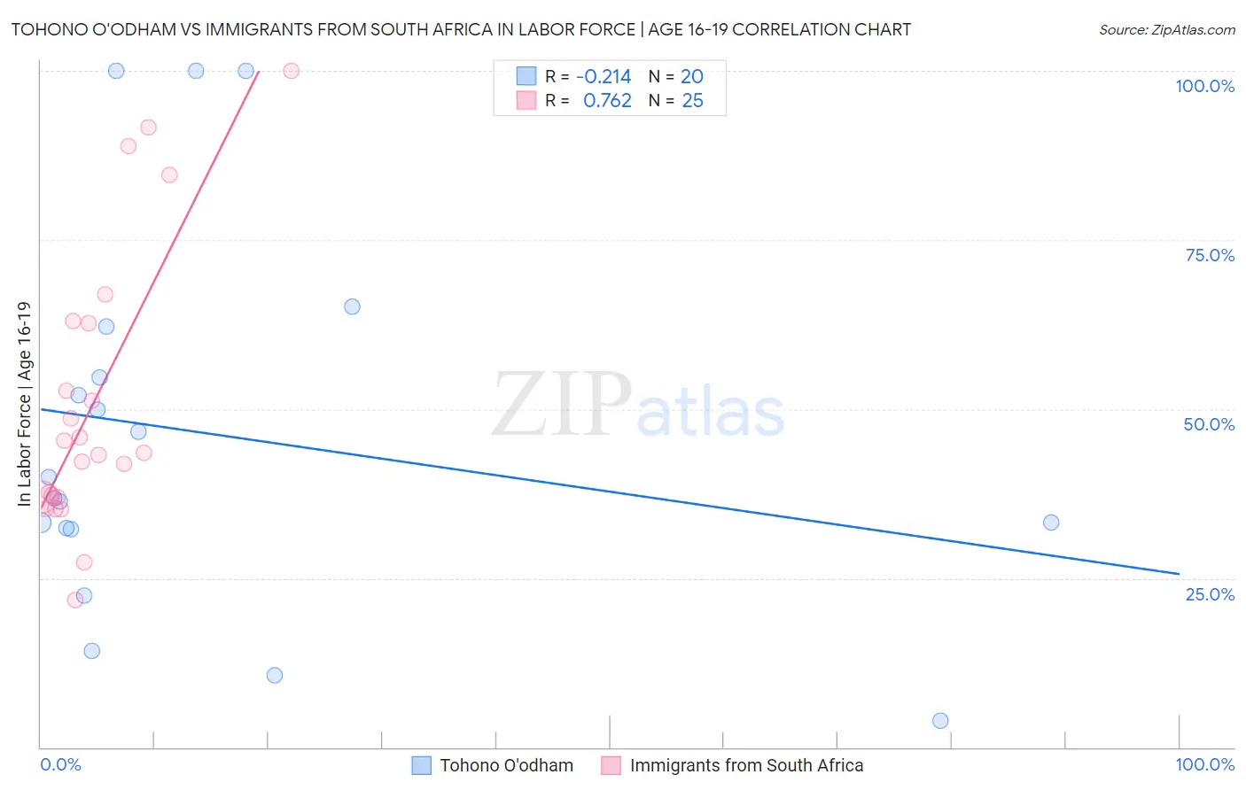 Tohono O'odham vs Immigrants from South Africa In Labor Force | Age 16-19 Correlation Chart