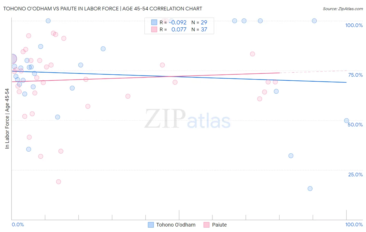 Tohono O'odham vs Paiute In Labor Force | Age 45-54 Correlation Chart
