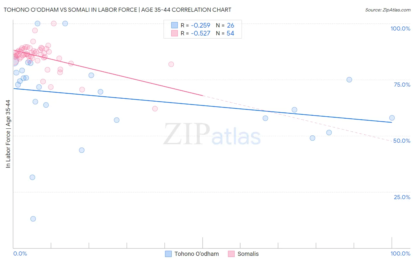 Tohono O'odham vs Somali In Labor Force | Age 35-44 Correlation Chart