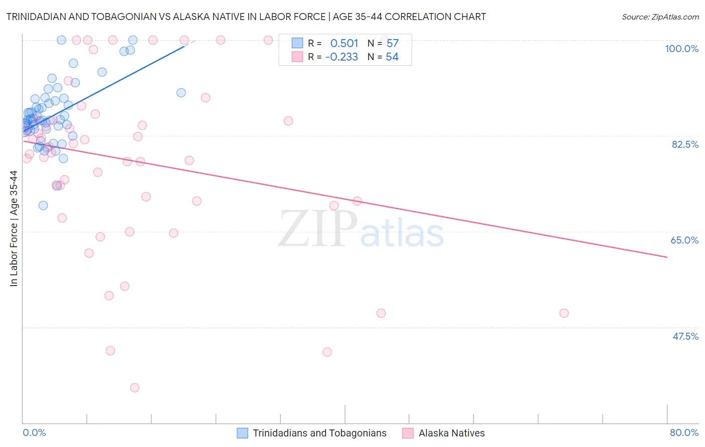 Trinidadian and Tobagonian vs Alaska Native In Labor Force | Age 35-44 Correlation Chart