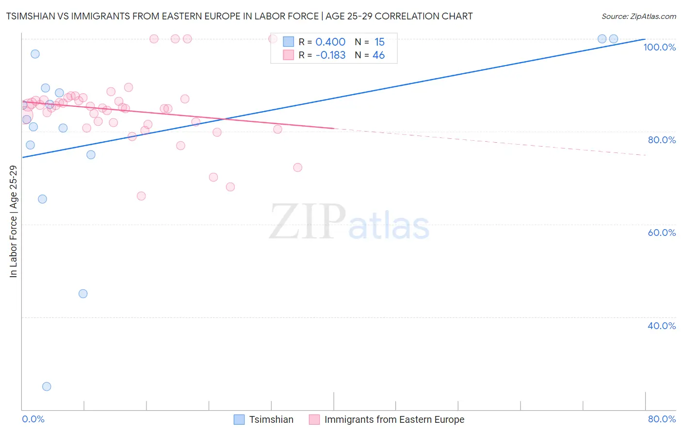 Tsimshian vs Immigrants from Eastern Europe In Labor Force | Age 25-29 Correlation Chart