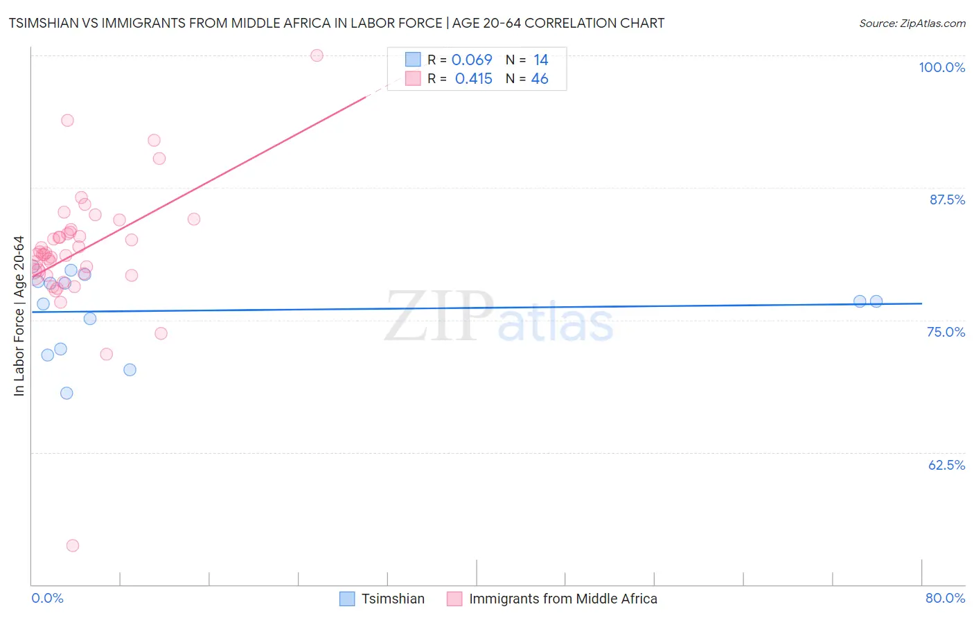 Tsimshian vs Immigrants from Middle Africa In Labor Force | Age 20-64 Correlation Chart