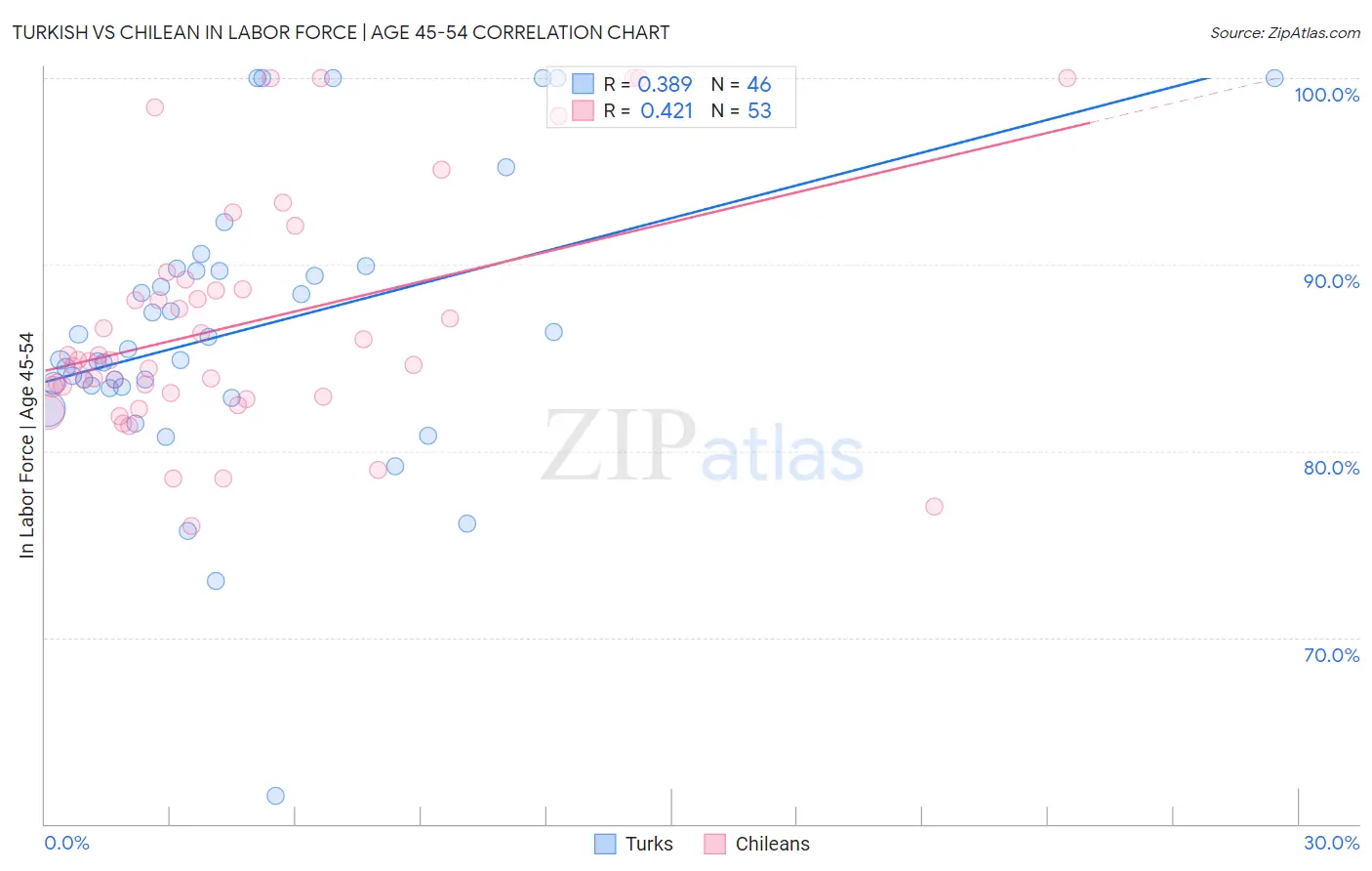 Turkish vs Chilean In Labor Force | Age 45-54 Correlation Chart