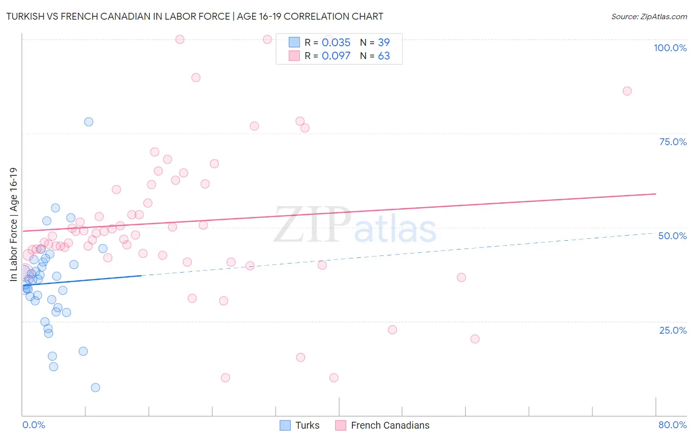 Turkish vs French Canadian In Labor Force | Age 16-19 Correlation Chart