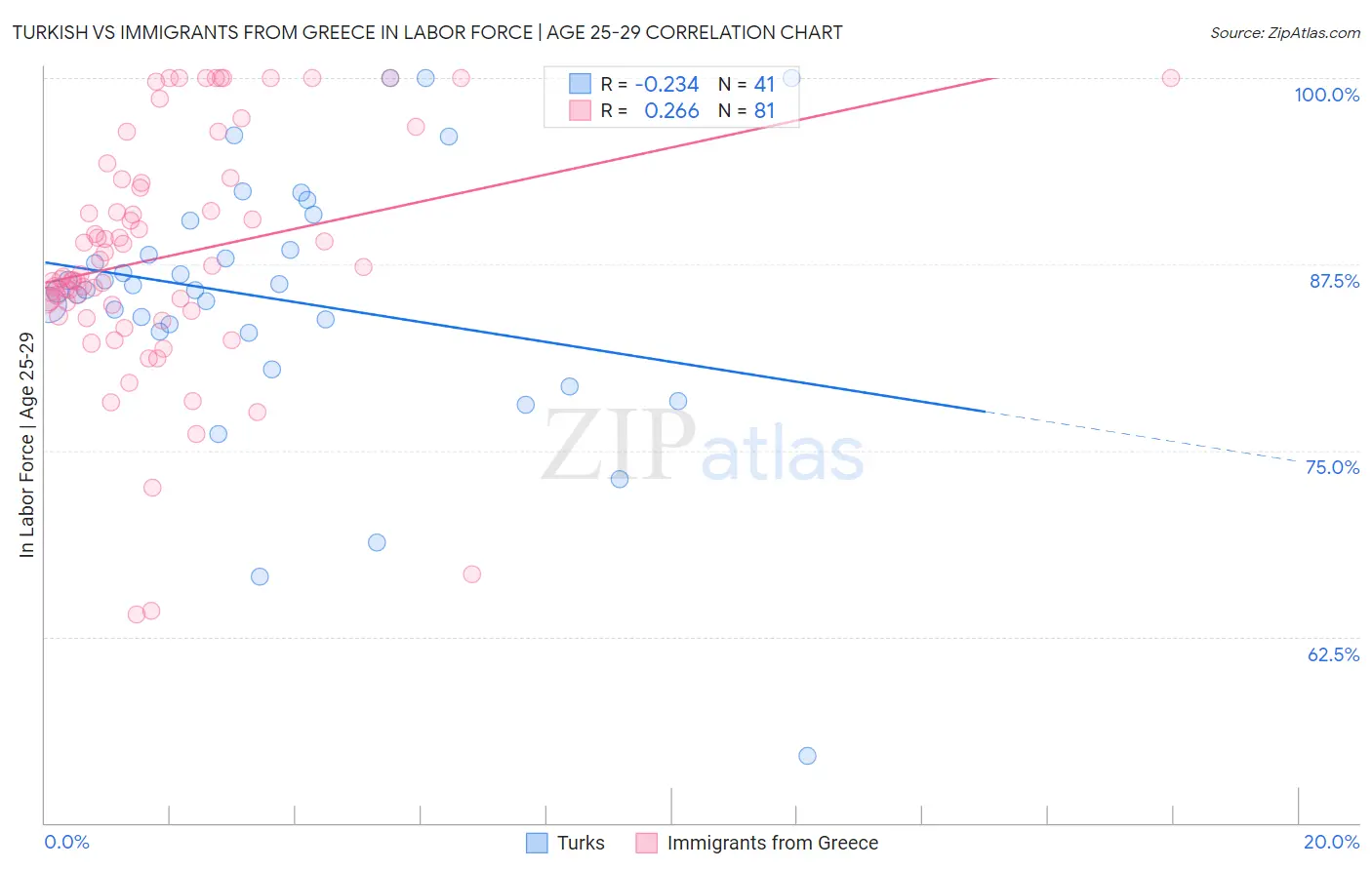 Turkish vs Immigrants from Greece In Labor Force | Age 25-29 Correlation Chart