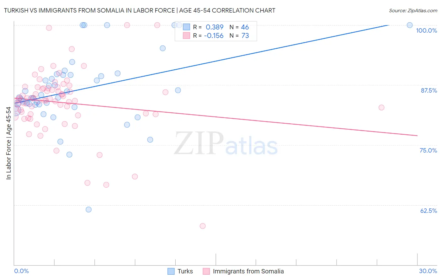 Turkish vs Immigrants from Somalia In Labor Force | Age 45-54 Correlation Chart