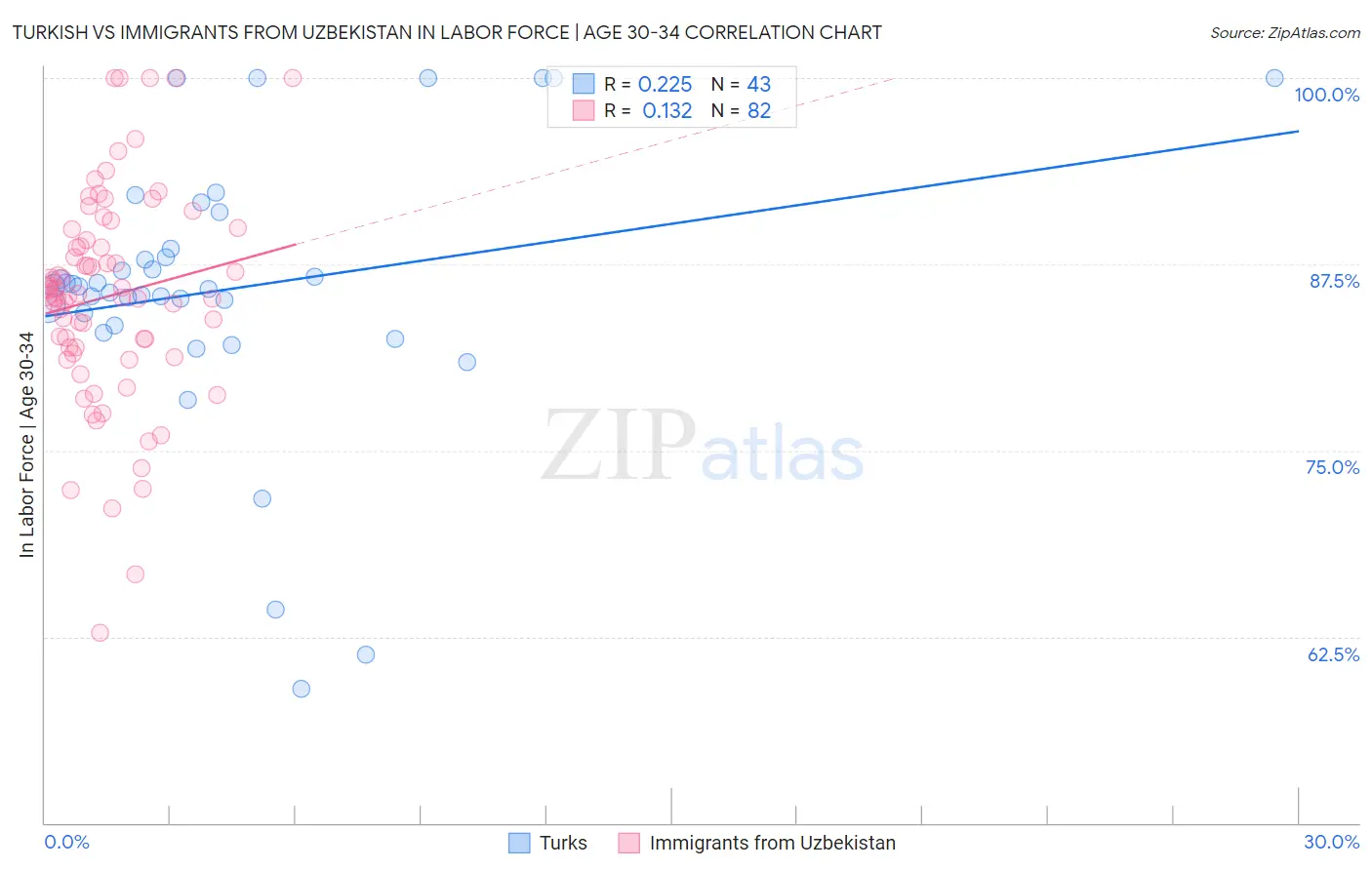 Turkish vs Immigrants from Uzbekistan In Labor Force | Age 30-34 Correlation Chart