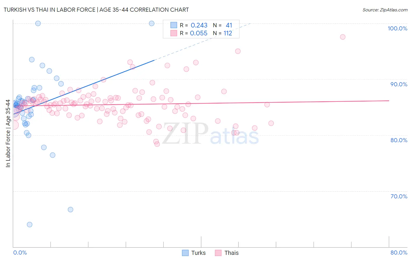 Turkish vs Thai In Labor Force | Age 35-44 Correlation Chart
