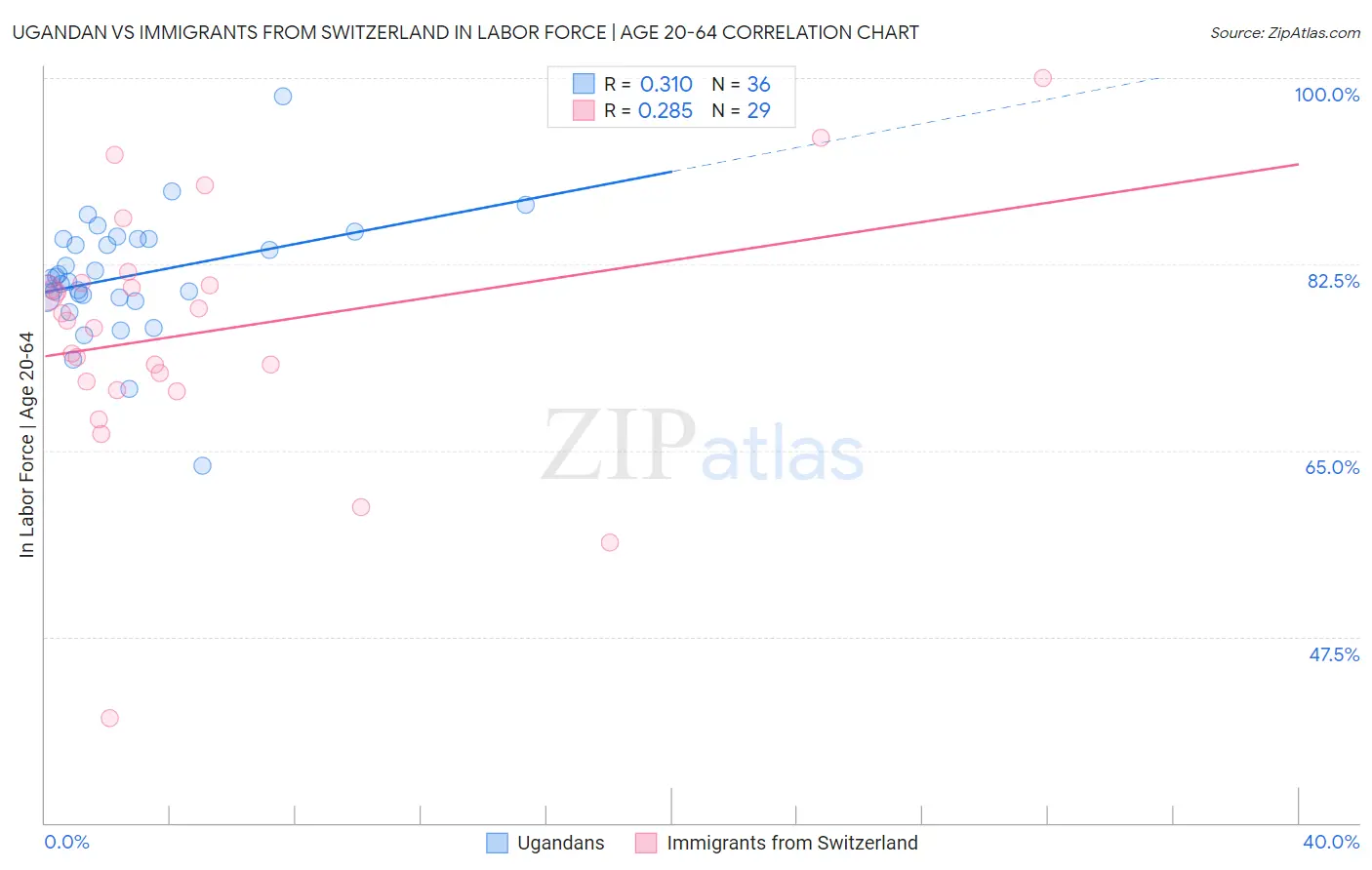 Ugandan vs Immigrants from Switzerland In Labor Force | Age 20-64 Correlation Chart