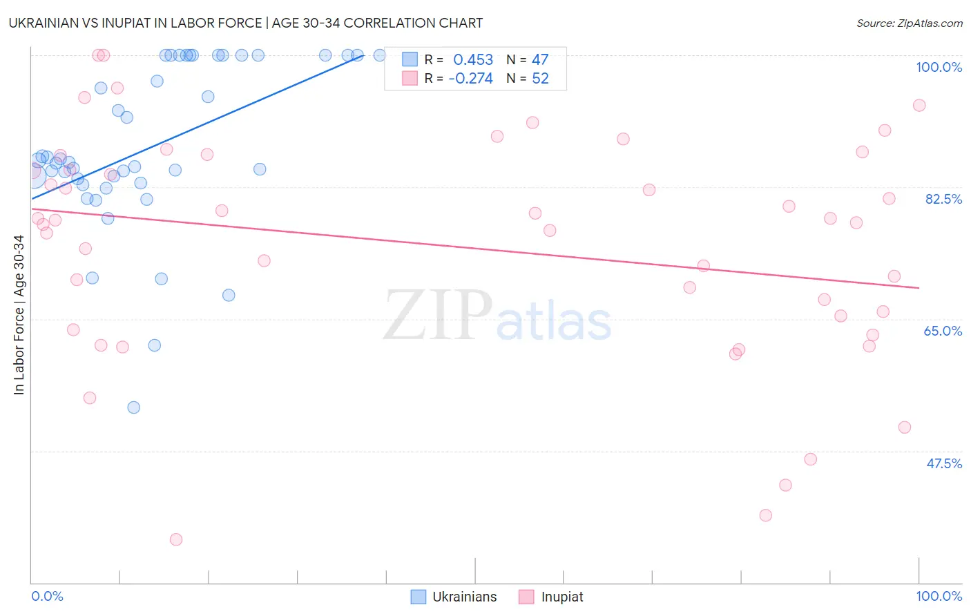 Ukrainian vs Inupiat In Labor Force | Age 30-34 Correlation Chart