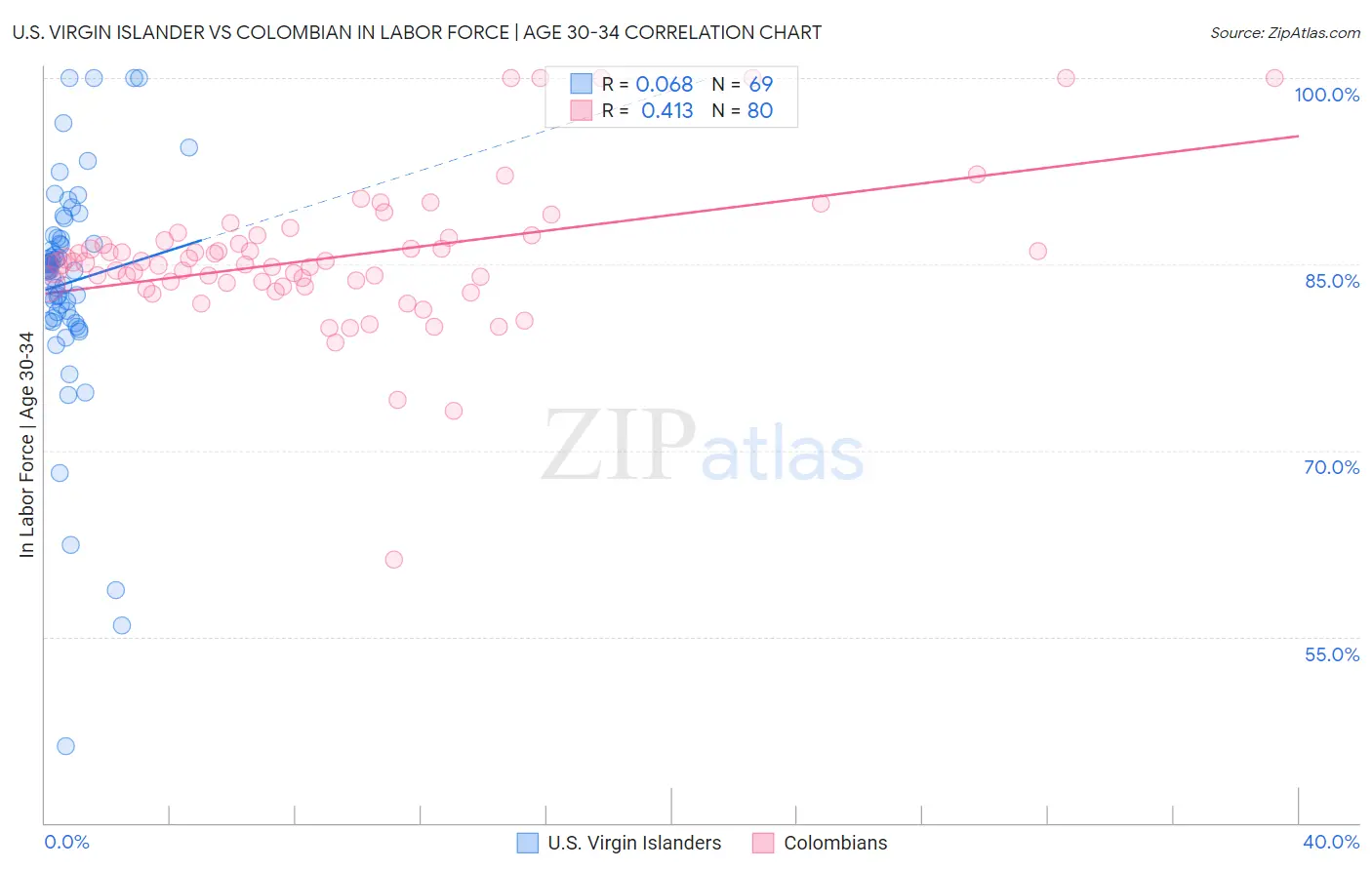 U.S. Virgin Islander vs Colombian In Labor Force | Age 30-34 Correlation Chart