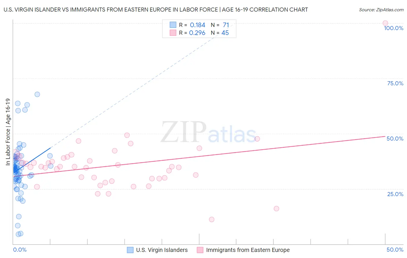 U.S. Virgin Islander vs Immigrants from Eastern Europe In Labor Force | Age 16-19 Correlation Chart
