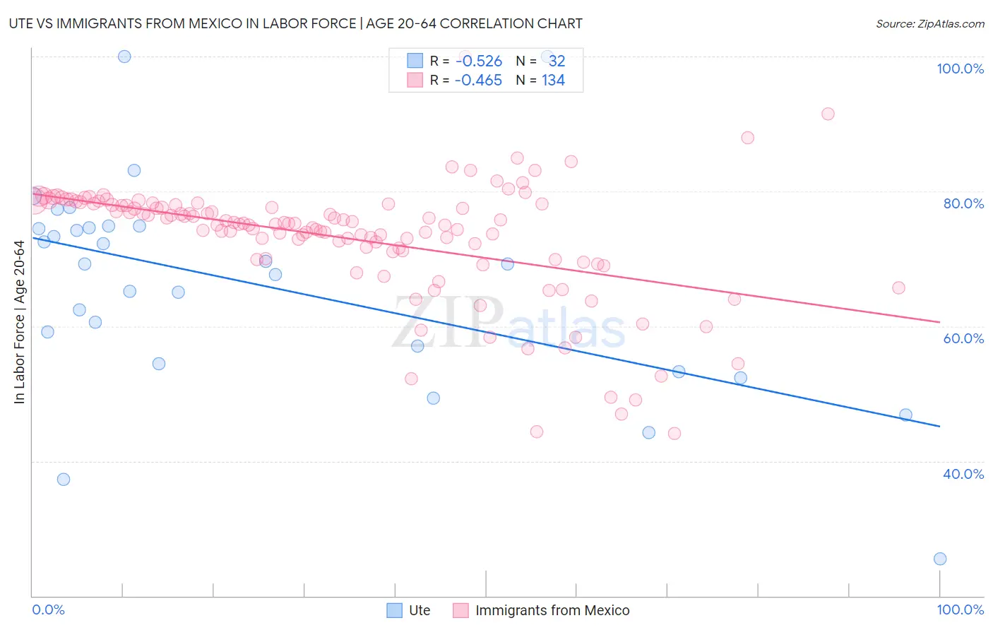 Ute vs Immigrants from Mexico In Labor Force | Age 20-64 Correlation Chart