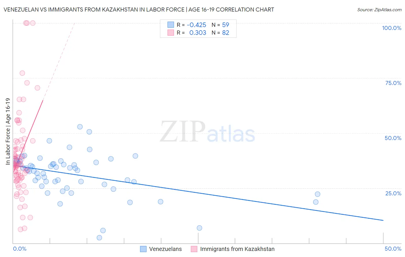 Venezuelan vs Immigrants from Kazakhstan In Labor Force | Age 16-19 Correlation Chart
