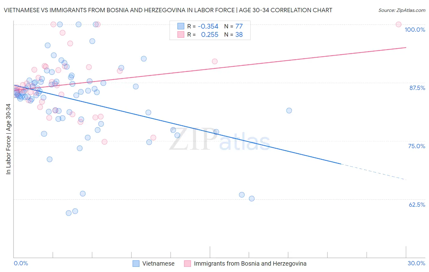 Vietnamese vs Immigrants from Bosnia and Herzegovina In Labor Force | Age 30-34 Correlation Chart