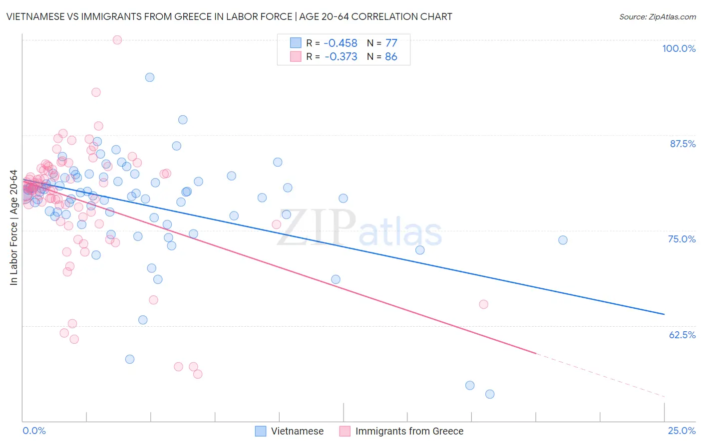 Vietnamese vs Immigrants from Greece In Labor Force | Age 20-64 Correlation Chart