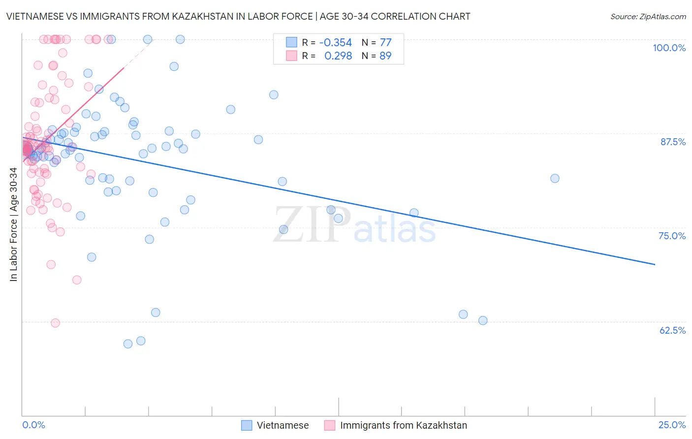 Vietnamese vs Immigrants from Kazakhstan In Labor Force | Age 30-34 Correlation Chart