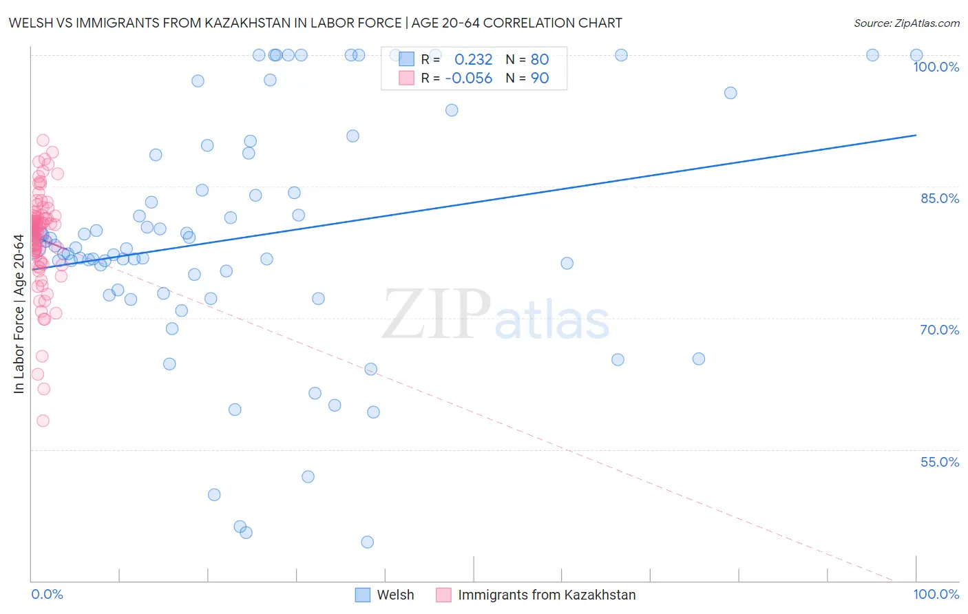 Welsh vs Immigrants from Kazakhstan In Labor Force | Age 20-64 Correlation Chart