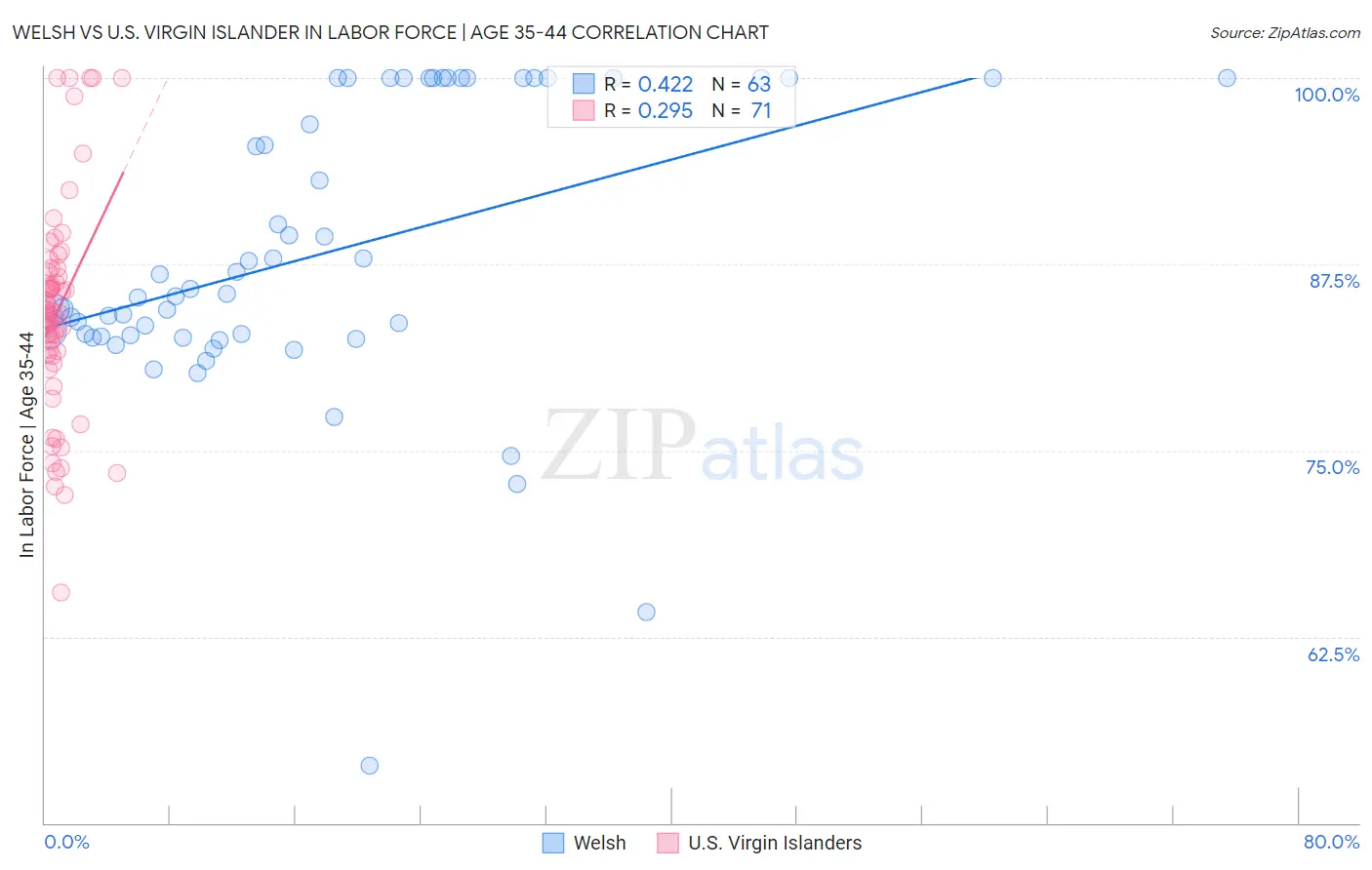 Welsh vs U.S. Virgin Islander In Labor Force | Age 35-44 Correlation Chart